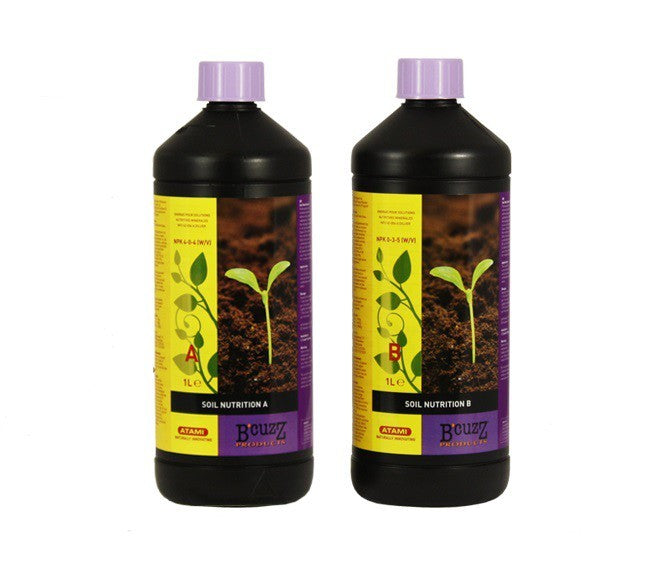 The (young) plant needs important nutrients. In this respect, our B'cuzz Soil A+B fertilizer remains the basis for beautiful growing results when growing in soil or substrates. Professional biomineral fertilizer that ensures a stable and biologically balanced substrate. Soil fertilizer A + B contains almost all the necessary nutrients for the entire growing period. Soil fertilizer A + B is suitable for both indoor and outdoor cultivation.