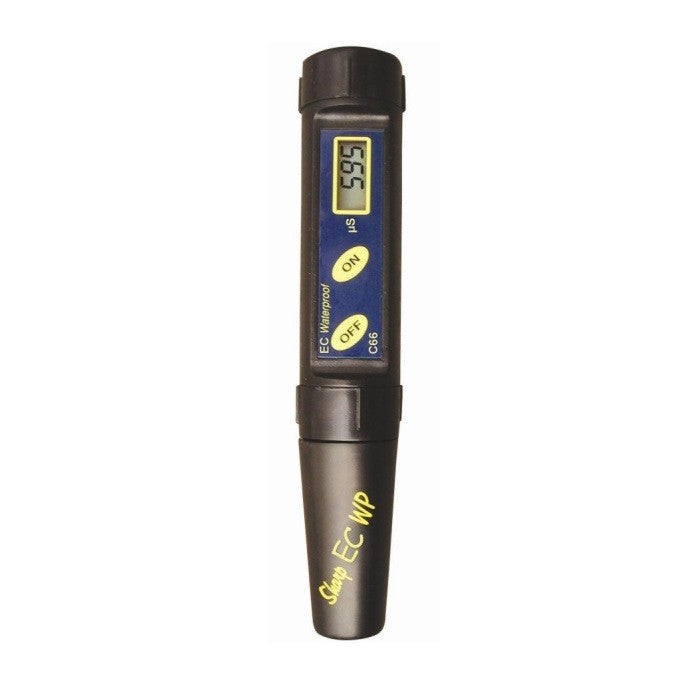 Milwaukee Sharp is a waterproof digital EC meter. It has a large single-line LCD display that shows the measured values in EC. It measures EC in the range of 0.00 to 10.00 mS/cm. The electrode is user-replaceable. Calibration is manual and single-point.