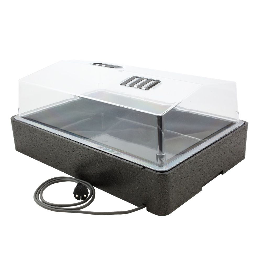 Solid mini greenhouse Large. Heated. Dimensions: 60x40x25 cm. The propagator consists of a waterproof base and a transparent lid. For easier handling, it is equipped with manual ventilation holes.
