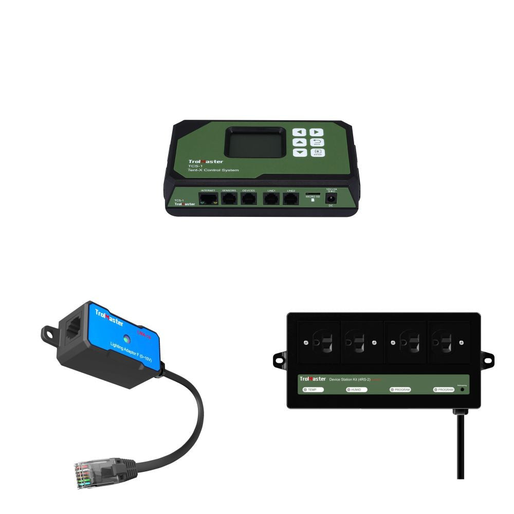 Trolmaster Set Tent-X Basic obsahuje řídicí jednotku Trolmaster Tent-X Main Controller 3-in-1 Sensor (TCS-1), Trolmaster Device Station Kit includes 1x DST, 1x DSH, 2x DSP (4RS-2E) and Trolmaster Lighting Control Adapter F per 0-10V protocol (LMA-14).