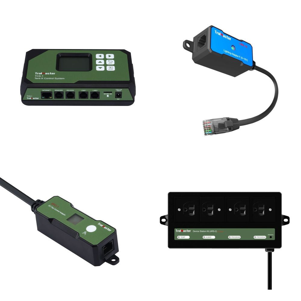 Trolmaster Set Tent-X EC Fan obsahuje řídicí jednotku Trolmaster Tent-X Main Controller 3-in-1 Sensor (TCS-1), Trolmaster Device Station Kit including 1x DST, 1x DSH, 2x DSP (4RS-2E), Trolmaster Lighting Control Adapter F per 0-10V protocol (LMA-14) and Trolmaster EC Fan Control Adapter (EFC-1).