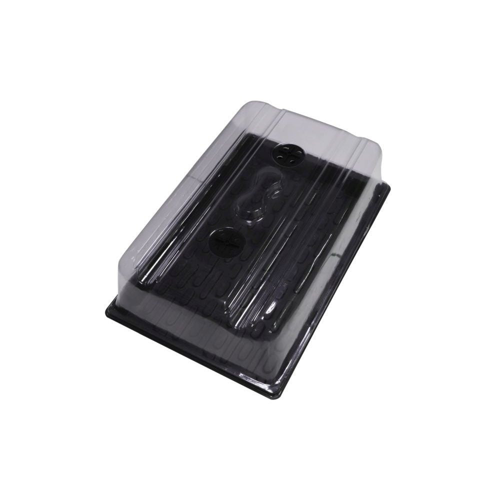 Gewächshaus mit Boden und Deckel mit Nut für zwei GENT LED 18W Lampen. Abmessungen 58x37,5x22 cm. Schwarze Farbe, strukturierte Oberfläche des Bodens, Belüftungsklappen im Deckel. Lampen müssen separat erworben werden. Für die Verbindung der Lampen wird ein Daisy Chain Kabel benötigt.